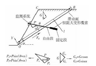 下滑力監測方法為通過恒阻大變形纜索穿過滑動面,對邊坡巖體施加一個預應力 p。通過可以直接測出的擾動力 p,可以推導擾動力和滑動力之間的函數關系,*終得到滑動力的變化量 addin ne.ref.{ce1bd0ee-846a-4eb8-8fcf-f644930163e4}[3]。邊坡滑動力監測力學模型見圖1。由力的平衡原理,推導邊坡滑動力為
