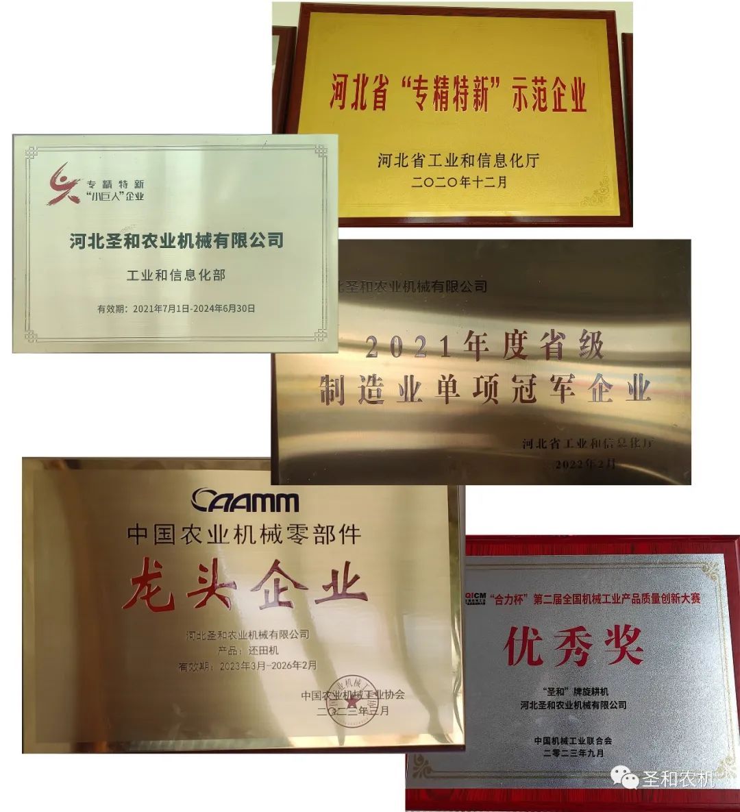 圣和公司為國家級專精特新“小巨人”企業(yè)、河北省“專精特新”示范企業(yè),2021年入選河北省民營企業(yè)社會(huì)責(zé)任100強(qiáng)企業(yè),河北省工業(yè)和信息化廳頒發(fā)的“2021年度省級制造業(yè)單項(xiàng)冠軍企業(yè)”。2022年圣和公司入選河北省首批縣域特色產(chǎn)業(yè)集群“領(lǐng)跑者”企業(yè)名單;2022年圣和牌旋耕機(jī)和還田機(jī)全國銷量第一;2023年中國機(jī)械工業(yè)聯(lián)合會(huì)第二屆全國機(jī)械工業(yè)產(chǎn)品質(zhì)量創(chuàng)新大賽圣和牌旋耕機(jī)榮獲“優(yōu)秀獎(jiǎng)”;中國農(nóng)業(yè)機(jī)械工業(yè)協(xié)會(huì)評選為2023-2026年度“中國農(nóng)業(yè)機(jī)械零部件龍頭企業(yè)”。