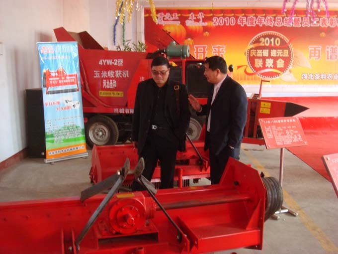 董事長王新芳(左二)向夏海榮站長(左一)介紹公司秸稈切碎還田機