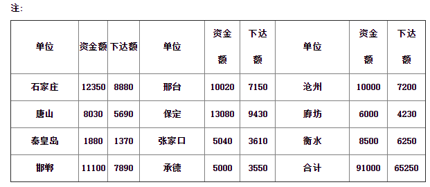 | 平泉縣 | 680 | 480 | 滄州運河區(qū) | 100 | 70 | 合計 | 91000 | 65250 |
