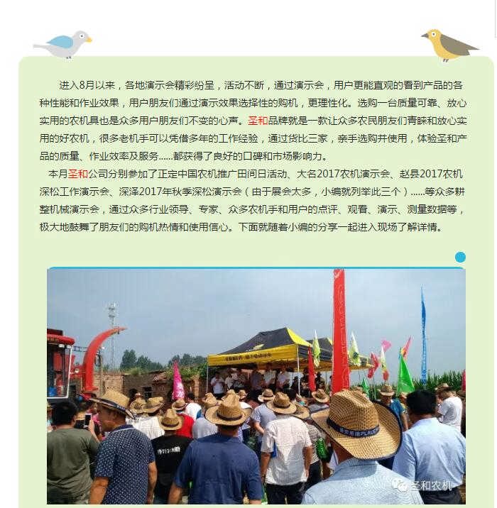 作為國(guó)家旋耕機(jī)標(biāo)準(zhǔn)起草單位、河北省著名商標(biāo)、河北省優(yōu)質(zhì)產(chǎn)品、更是一家集生產(chǎn)、研發(fā)、流通為一體的科技型企業(yè),深松旋耕機(jī)、雙軸滅茬旋耕機(jī)安全標(biāo)志及防護(hù)裝置示范單位”、“中國(guó)旋耕機(jī)協(xié)會(huì)理事長(zhǎng)單位”、“中國(guó)農(nóng)業(yè)機(jī)械化協(xié)會(huì)會(huì)員單位”、“中國(guó)農(nóng)業(yè)機(jī)械流通協(xié)會(huì)理事單位”、“河北省生產(chǎn)與流通協(xié)會(huì)常務(wù)理事單位”、“河北工業(yè)大學(xué)機(jī)械工程學(xué)院-產(chǎn)、學(xué)、研合作基地”,擁有市級(jí)研發(fā)中心,公司一直致力于保護(hù)性耕整耕種機(jī)具的研發(fā),在中國(guó)農(nóng)機(jī)具研發(fā)領(lǐng)域取得特別優(yōu)異的成果,目前已經(jīng)有近百種的農(nóng)機(jī)產(chǎn)品在全國(guó)范圍內(nèi)享受農(nóng)機(jī)購(gòu)置補(bǔ)貼,部分產(chǎn)品走出國(guó)際市場(chǎng),遠(yuǎn)銷海外,并受到一致好評(píng)。不斷更新,不斷完善,不斷進(jìn)取......立足長(zhǎng)遠(yuǎn)發(fā)展于未來(lái),圣和-您信賴的農(nóng)機(jī)品牌!買農(nóng)機(jī)、選圣和!