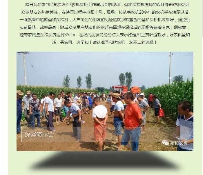經(jīng)過(guò)輾轉(zhuǎn)我們又來(lái)到了深澤2017年秋季深松演示會(huì)的現(xiàn)場(chǎng)為您帶來(lái)一線現(xiàn)場(chǎng)的深松、耕整盛況:多家玉米收獲機(jī)演示過(guò)后,觀眾為接下來(lái)的耕整機(jī)械吊足了胃口,圣和1SS-270型深松機(jī)閃亮登場(chǎng),氣質(zhì)不凡的“小伙兒”蓄勢(shì)待發(fā),一口氣卯足了勁,三加五除二的快速深松過(guò)去,現(xiàn)場(chǎng)觀眾還沒來(lái)得及過(guò)足癮就完成任務(wù)!此前多位農(nóng)民朋友就已經(jīng)有意選購(gòu)如此如意產(chǎn)品,都在等待這場(chǎng)令人矚目和期待的演示會(huì),看到如此演示效果,笑容變得更加燦爛,紛紛表示再來(lái)一圈!經(jīng)過(guò)大伙的測(cè)量深松深度達(dá)到了將近38cm左右!在隨后普勞恩德(河北)農(nóng)業(yè)機(jī)械有限公司生產(chǎn)的普勞恩德PLAUERN旋耕機(jī)受到朋友們的高度關(guān)注,它采用德國(guó)技術(shù),實(shí)現(xiàn)了旋耕機(jī)質(zhì)的飛躍---采用流線型設(shè)計(jì),零部件靜電等離子噴涂,整機(jī)流水線組裝,加工時(shí)依靠工裝、模具保證零部件的尺寸精度(側(cè)板沖壓成型、一次沖孔;刀軸焊后加工;主梁焊后加工),從而保證了整機(jī)裝配精度;上蓋板為圓弧活蓋式,使刀軸回轉(zhuǎn)上腔體空間加大,作業(yè)中甩起的泥土不易粘結(jié),同時(shí)有利于維修保養(yǎng);采用加重型刀庫(kù),精密鑄造成型;采用日本進(jìn)口刀片,持久耐用。廠內(nèi)安裝刀片,交付用戶以后,不用再為刀片錯(cuò)裝而煩惱。變速箱逐臺(tái)進(jìn)行磨合試驗(yàn),刀軸旋轉(zhuǎn)靈活,旋耕機(jī)作業(yè)時(shí)可節(jié)省8~10馬力。刀軸采用機(jī)器人焊接,雙層迷宮槽式防塵罩,有效保護(hù)軸承不受惡劣作業(yè)環(huán)境的影響,延長(zhǎng)了使用壽命。加寬后托板,確保達(dá)到最佳平地效果。防磨板采用加寬、加大結(jié)構(gòu),可根據(jù)地域要求選擇配裝。側(cè)板兩側(cè)可選裝切草刀,斬?cái)?、分離工作中堆積的草團(tuán)。整機(jī)覆膜、木箱包裝,既保護(hù)了整機(jī)外觀的亮麗如新,又節(jié)省了運(yùn)輸、儲(chǔ)存空間。真是買不知道,不用不知道,此次演示會(huì)獲得了眾多農(nóng)機(jī)合作社和老機(jī)手的充分肯定,圣和農(nóng)機(jī)以真實(shí)的用戶體驗(yàn),完美的演示效果讓在場(chǎng)的每個(gè)人都心悅誠(chéng)服。