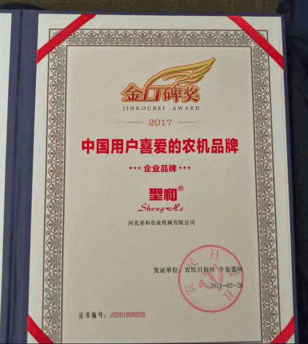 2018年2月24日,由農(nóng)民日報社主辦的“2017金口碑獎”頒獎盛典在北京舉行。近90家農(nóng)資企業(yè)代表、百余位種植大戶以及農(nóng)資管理部門、行業(yè)協(xié)會代表參加了頒獎典禮。今日,圣和公司開工之日,北京會議中心傳來好消息!圣和產(chǎn)品被農(nóng)民日報評為--“中國用戶喜愛的農(nóng)機品牌”,圣和公司已連續(xù)多年獲此殊榮,新年新開始,新的收獲!新的鼓勵!新的夢想!2018年圣和以新圣和!新理念!真誠歡迎全國廣大客商到訪洽談合作!為早日實現(xiàn)農(nóng)機強國做貢獻!