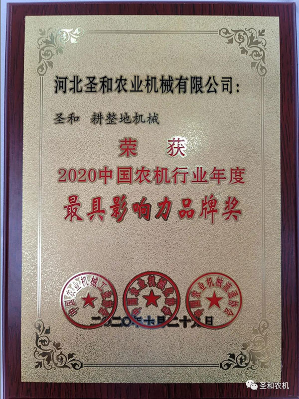 河北圣和農(nóng)業(yè)機械有限公司“圣和”品牌榮獲最具影響力品牌獎,也是全國農(nóng)機行業(yè)耕整地機械類唯一獲獎企業(yè)品牌。